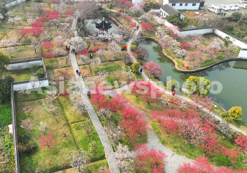 图片说明:3月1日,无人机航拍的苏州“林屋梅海”景区春花烂漫迷人景色。