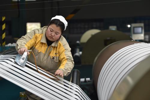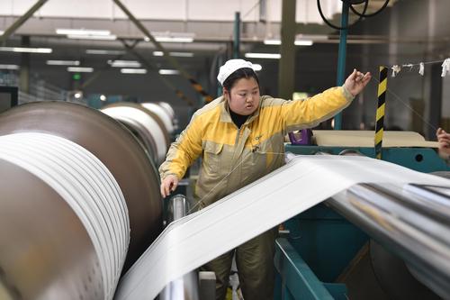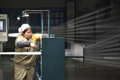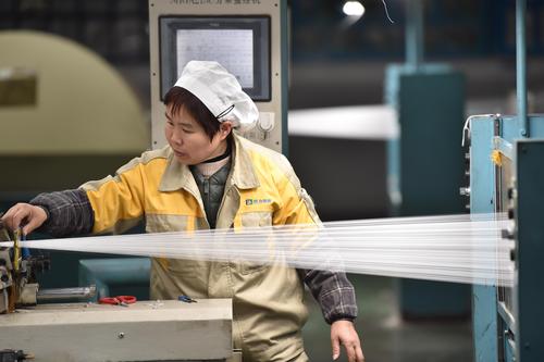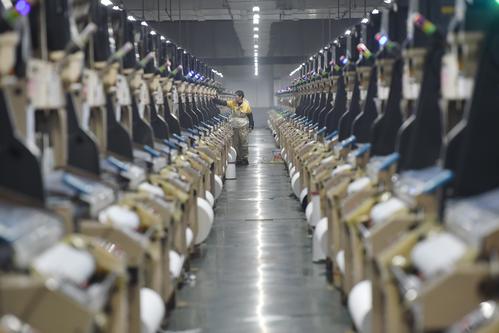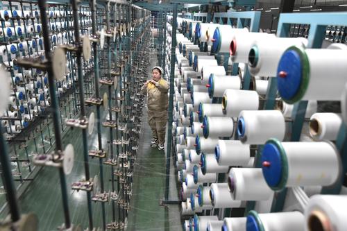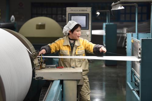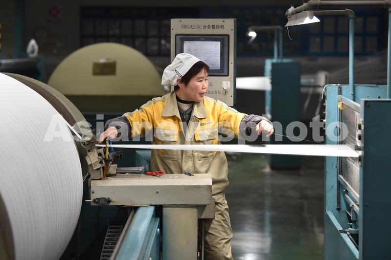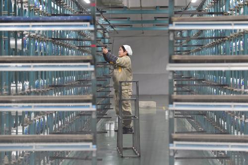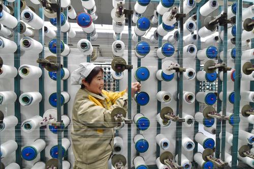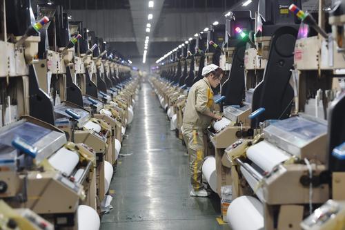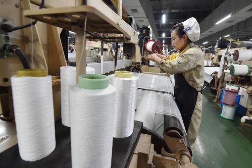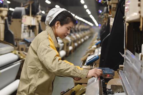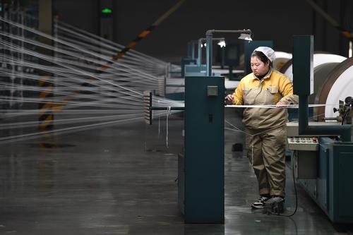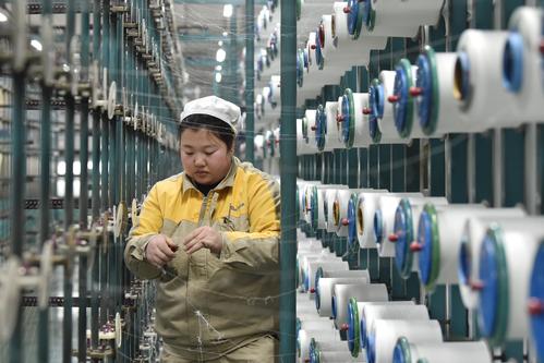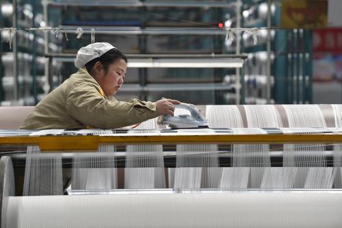 2023年3月1日,工人在江苏省宿迁市宿城区一家纺织企业的分条车间生产作业。