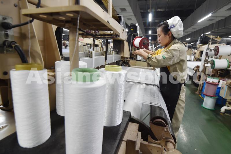 图片说明:2023年3月1日,工人在江苏省宿迁市宿城区一家纺织企业的织造车间生产作业。
