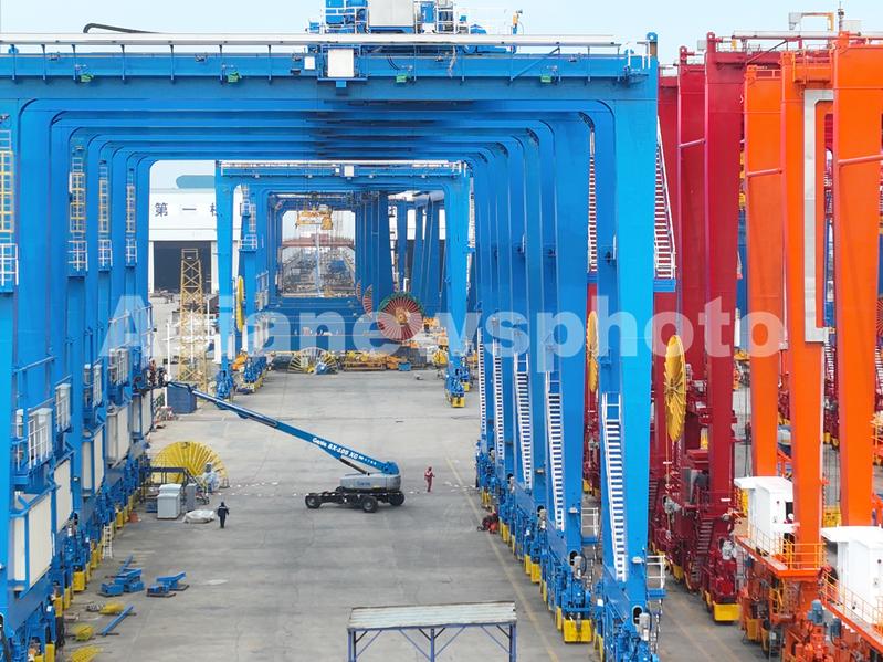 图片说明:2023年2月28日,工作人员在上海振华重工南通基地调试即将交付的港机产品。