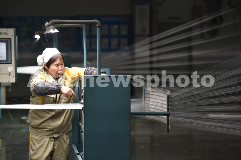 图片说明:2023年3月1日,工人在江苏省宿迁市宿城区一家纺织企业的分条车间生产作业。
