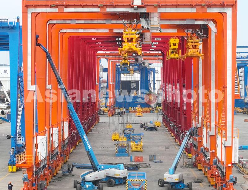 图片说明:2023年2月28日,工作人员在上海振华重工南通基地调试即将交付的港机产品。