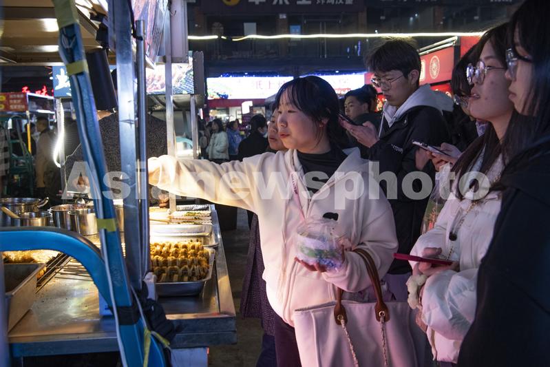 2023年3月2日晚,在浙江省金华市金帆街“金谷夜市”上,顾客在购买品尝小吃。
