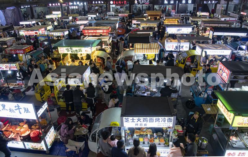 2023年3月2日晚,在浙江省金华市金帆街“金谷夜市”上,顾客在购买品尝小吃。