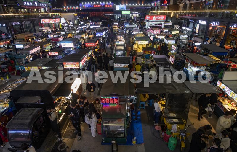2023年3月2日晚,在浙江省金华市金帆街“金谷夜市”上,顾客在购买品尝小吃。