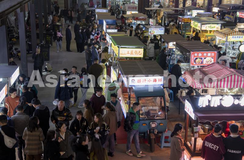 2023年3月2日晚,在浙江省金华市金帆街“金谷夜市”上,顾客在购买品尝小吃。