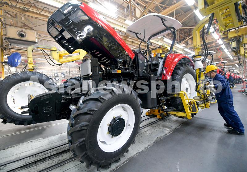 图片说明:2023年3月6日,在位于河南省洛阳市的中国一拖大拖公司总装生产线上,工人正在装配一批出口印度尼西亚的拖拉机。