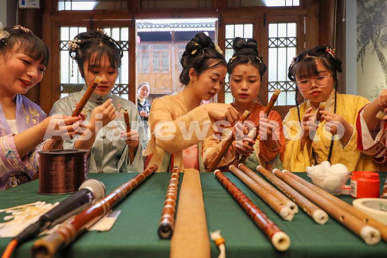 图片说明:2023年3月7日,游客在贵州省玉屏侗族自治县侗乡民族风情园景区体验箫笛制作。
