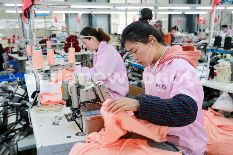 2023年3月7日,安徽省淮北市相山区渠沟镇张集村妇女在村办“微工厂”加工服装。