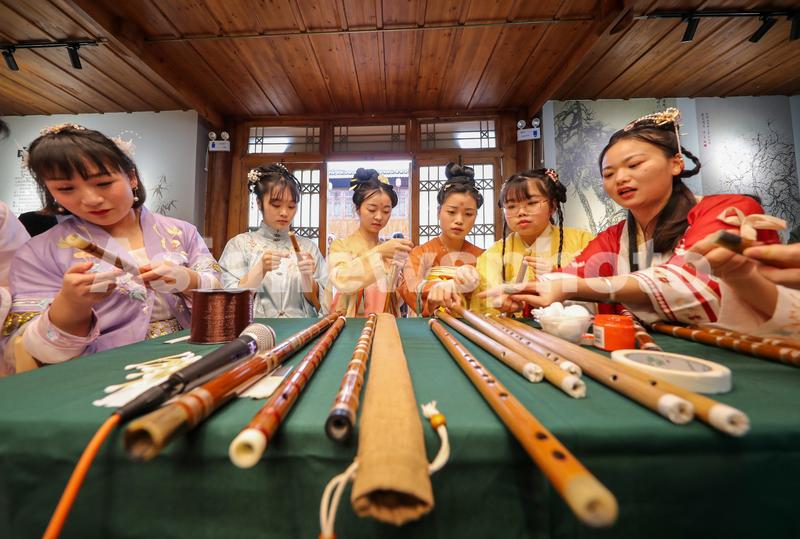 图片说明:2023年3月7日,游客在贵州省玉屏侗族自治县侗乡民族风情园景区体验箫笛制作。