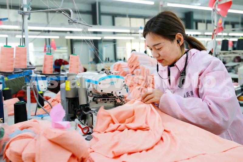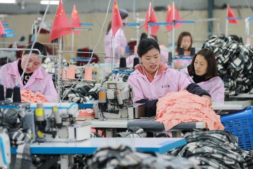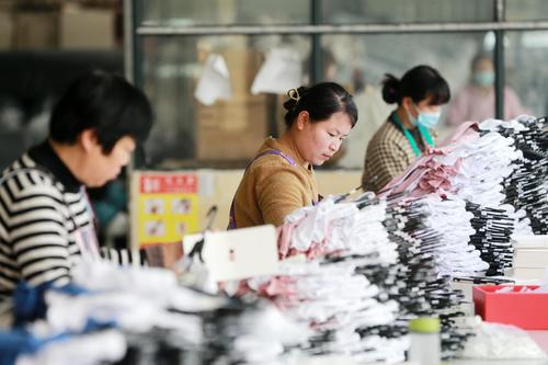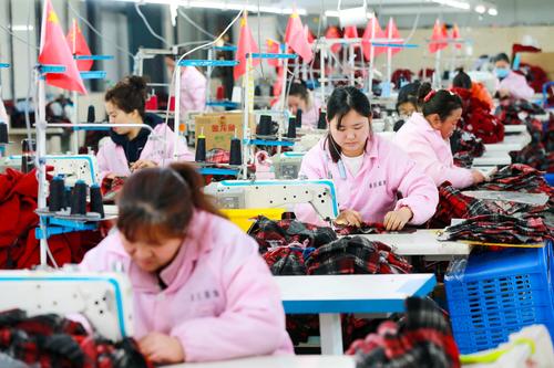 2023年3月7日,安徽省淮北市相山区渠沟镇张集村妇女在村办“微工厂”加工服装。