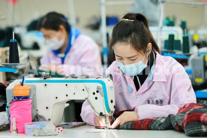 2023年3月7日,安徽省淮北市相山区渠沟镇张集村妇女在村办“微工厂”加工服装。