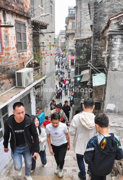 2023年3月4日,广东省江门市长堤历史文化街区,拍摄到游客经过墟顶老街。墟顶老街是江门城区的发源地,此处的“级级石”“水埗头”为墟顶老街的中心地带,是江门市的原点。