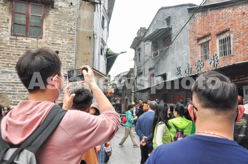 2023年3月4日,广东省江门市长堤历史文化街区,拍摄到游客举起手机拍照打卡留念。