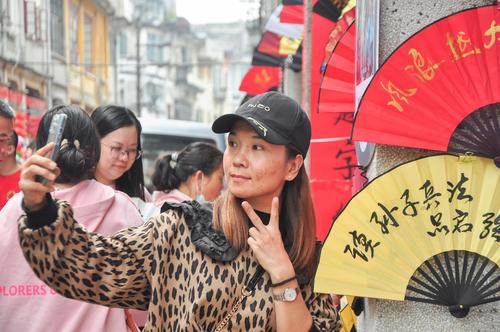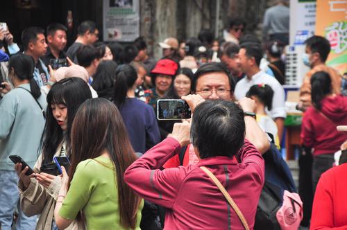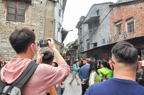 2023年3月4日,广东省江门市长堤历史文化街区,拍摄到游客在《狂飙》取景点拍照留念。