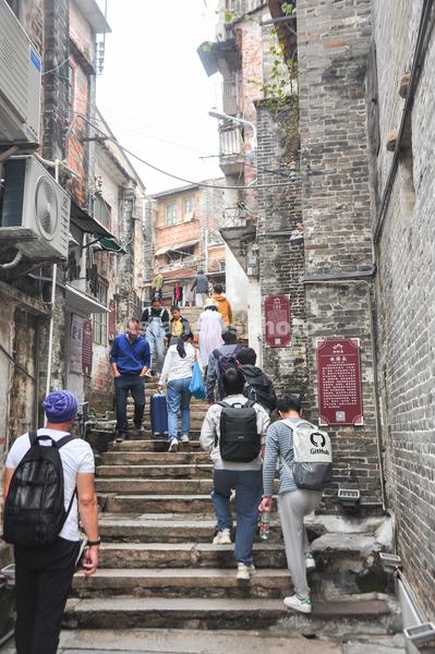 2023年2月11日,广东省江门市,拍摄到的长堤历史文化街区内的墟顶老街。墟顶老街是江门城区的发源地,此处的“级级石”“水埗头”为墟顶老街的中心地带,是江门市的原点。