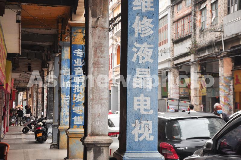 图片说明:2023年2月11日,广东省江门市,拍摄到的长堤历史文化街区内的骑楼,骑楼上印满了广告标语。