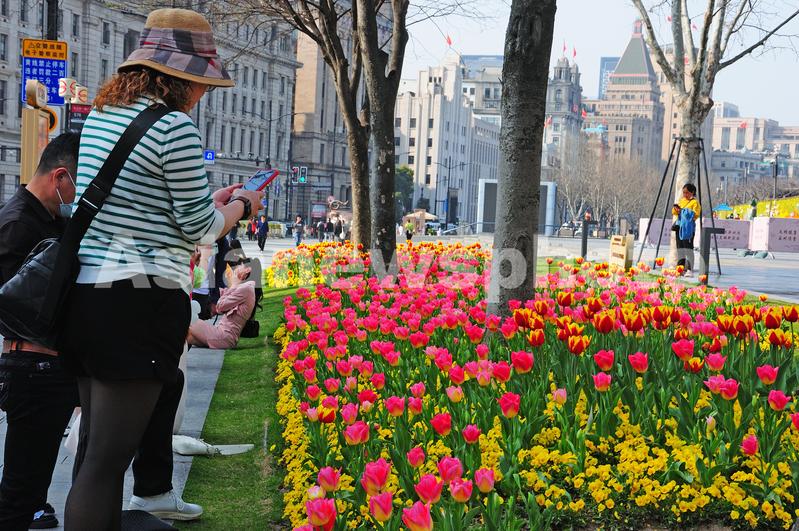 2023年3月9日,上海,郁金香绽放扮靓外滩街头,游客在打卡拍照。