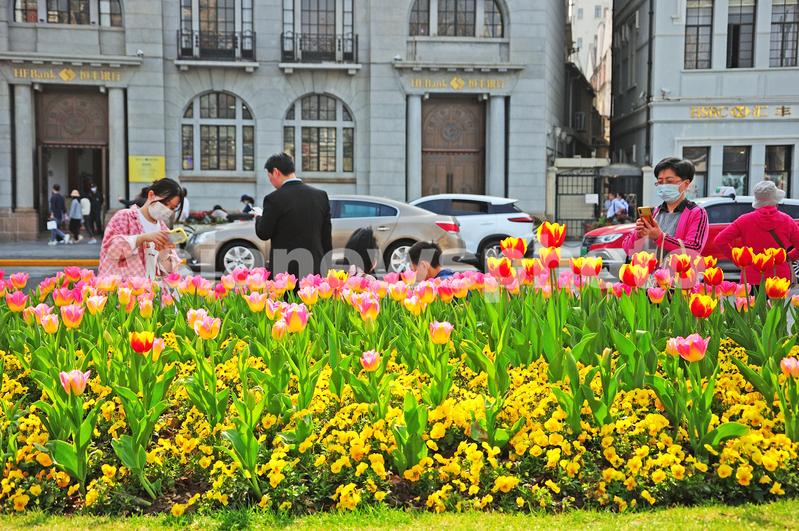 2023年3月9日,上海,郁金香绽放扮靓外滩街头,游客在打卡拍照。