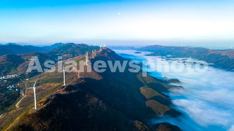 图片说明:2023年3月10日,江西省瑞昌市洪下乡蜈蚣山风电场,一台台发电机矗立在群山、云海之中,勾勒出一幅仙境般的美丽画卷。