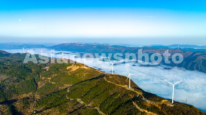 图片说明:2023年3月10日,江西省瑞昌市洪下乡蜈蚣山风电场,一台台发电机矗立在群山、云海之中,勾勒出一幅仙境般的美丽画卷。