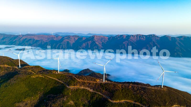 图片说明:2023年3月10日,江西省瑞昌市洪下乡蜈蚣山风电场,一台台发电机矗立在群山、云海之中,勾勒出一幅仙境般的美丽画卷。