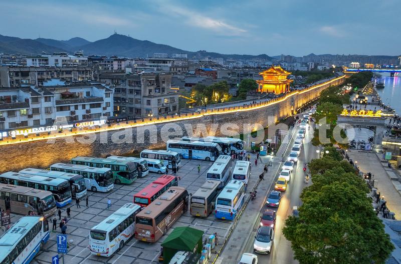 2023年3月10日,湖北省襄阳市,襄阳古城停车场停满了旅游大巴。