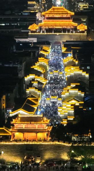 2023年3月10日,湖北省襄阳市,夜幕降临,襄阳古城华灯初上,古色古香的建筑与流光溢彩的灯光交相辉映,吸引了众多游客夜游古城。