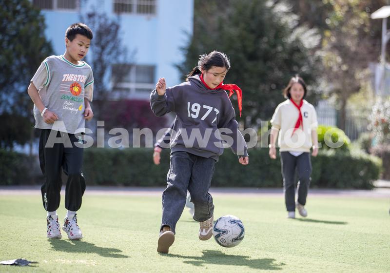 图片说明:2023年3月13日,贵州省从江县刚边壮族乡中心小学学生在体育课上踢足球。