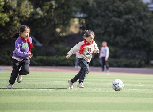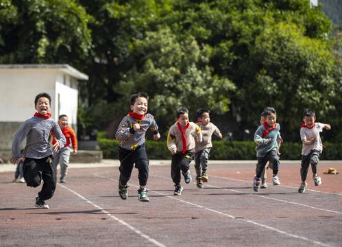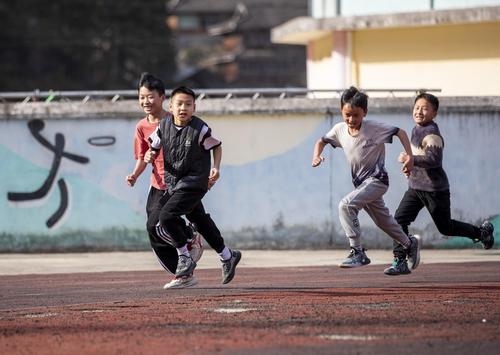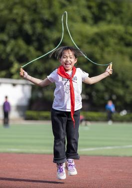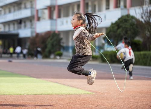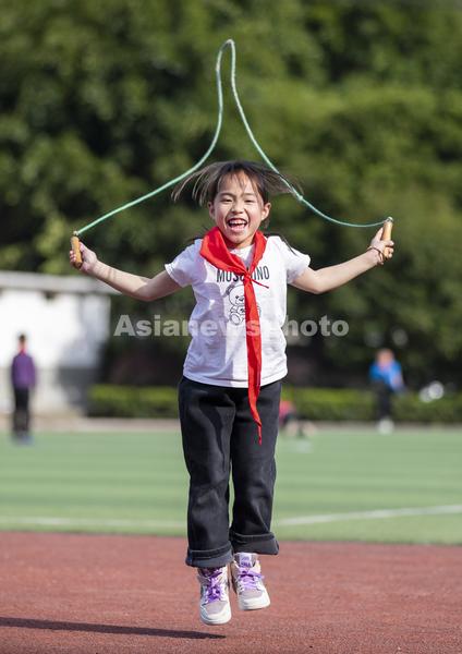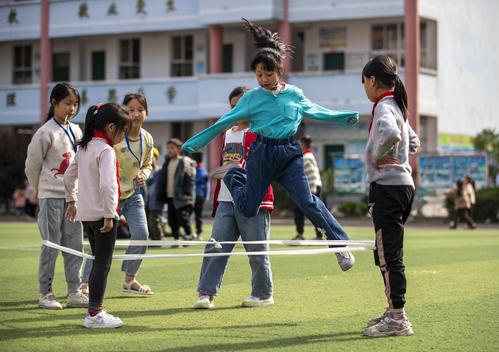图片说明:2023年3月13日,贵州省从江县刚边壮族乡中心小学学生在体育课上跳绳。