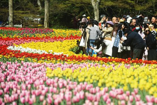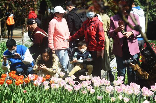 2023年3月14日,游客在杭州西湖太子湾公园观赏盛开的郁金香。
