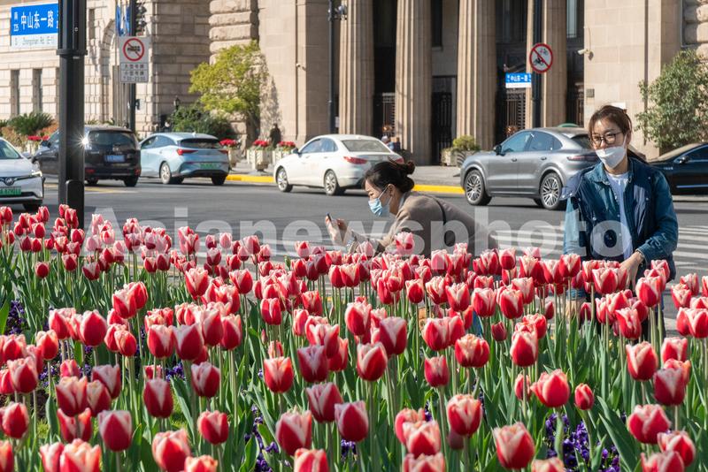2023年3月14日,上海外滩中山东一路沿线的郁金香已进入盛花期,美丽的春日风景吸引市民驻足赏花拍照。