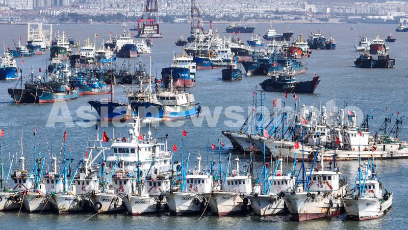 2023年3月14日,大批渔船停靠在山东省荣成市石岛管理区石岛渔港,躲避强风巨浪。