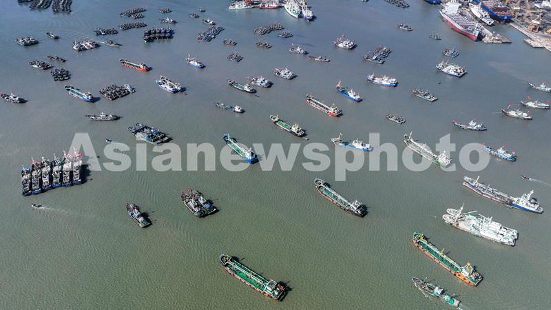 2023年3月14日,大批渔船停靠在山东省荣成市石岛管理区石岛渔港,躲避强风巨浪。