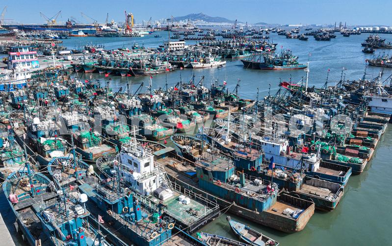 2023年3月14日,大批渔船停靠在山东省荣成市石岛管理区石岛渔港,躲避强风巨浪。