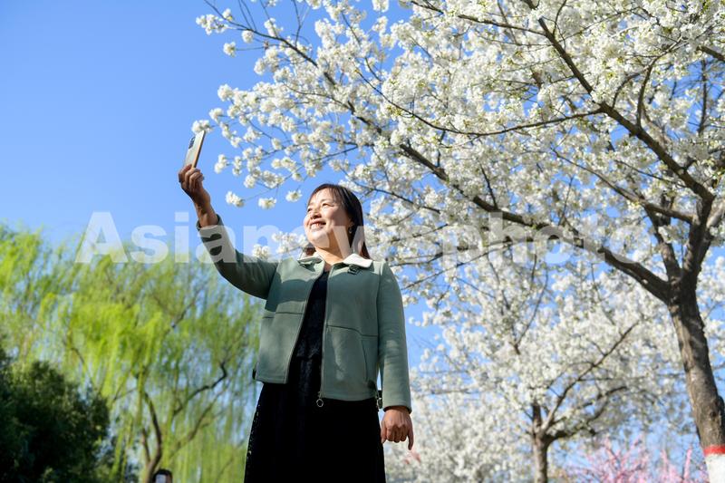 图片说明:2023年3月13日,市民在河南省洛阳市洛浦公园南堤“樱花大道”内休闲。