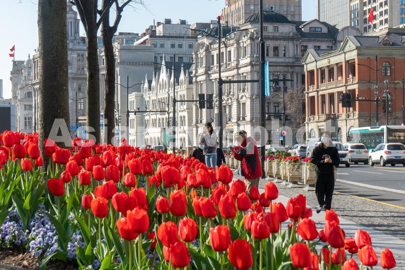 2023年3月14日,上海外滩中山东一路沿线的郁金香已进入盛花期,美丽的春日风景吸引市民驻足赏花拍照。