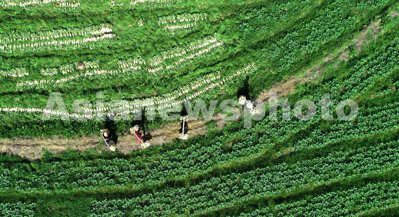 图片说明:2023年3月13日,湖南省涟源市桥头河镇新塘村,农民朋友在地里采收萝卜(无人机照片)。