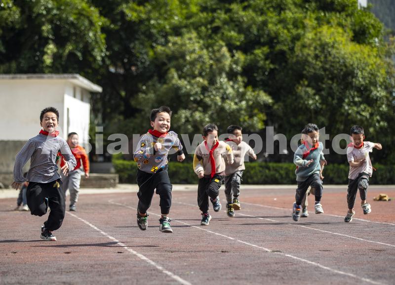 图片说明:2023年3月13日,贵州省从江县刚边壮族乡中心小学学生在体育课上参加跑步运动。