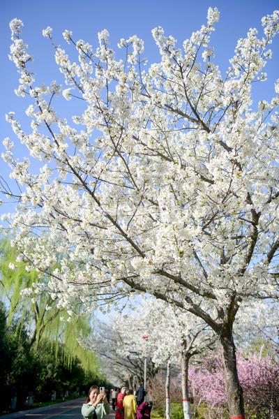 图片说明:2023年3月13日,市民在河南省洛阳市洛浦公园南堤“樱花大道”内休闲。