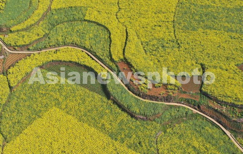 图片说明:2023年3月14日,在贵州省六盘水市六枝特区木岗镇抵岗村拍摄的油菜花田。