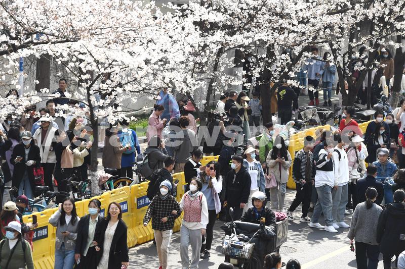 图片说明:2023年3月15日,游客在南京鸡鸣寺樱花大道上观赏拍摄樱花。