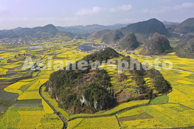 图片说明:2023年3月14日,在贵州省六盘水市六枝特区木岗镇抵岗村拍摄的油菜花田。