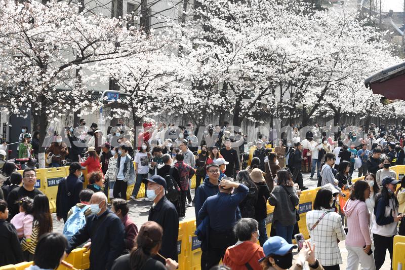 图片说明:2023年3月15日,游客在南京鸡鸣寺樱花大道上观赏拍摄樱花。