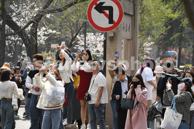 图片说明:2023年3月15日,游客在南京鸡鸣寺樱花大道上观赏拍摄樱花。