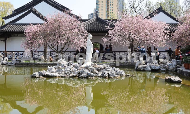 2023年3月16日,游人在南京莫愁湖公园赏花拍照。近日,南京莫愁湖公园海棠花盛开,园内处处花红柳绿,一派春意盎然。