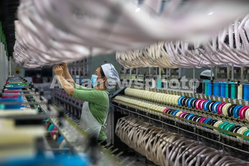 2023年3月15日,广西梧州市蒙山县一家纺织企业生产车间内,工人们在生产线上忙碌,生产车间一片繁忙。