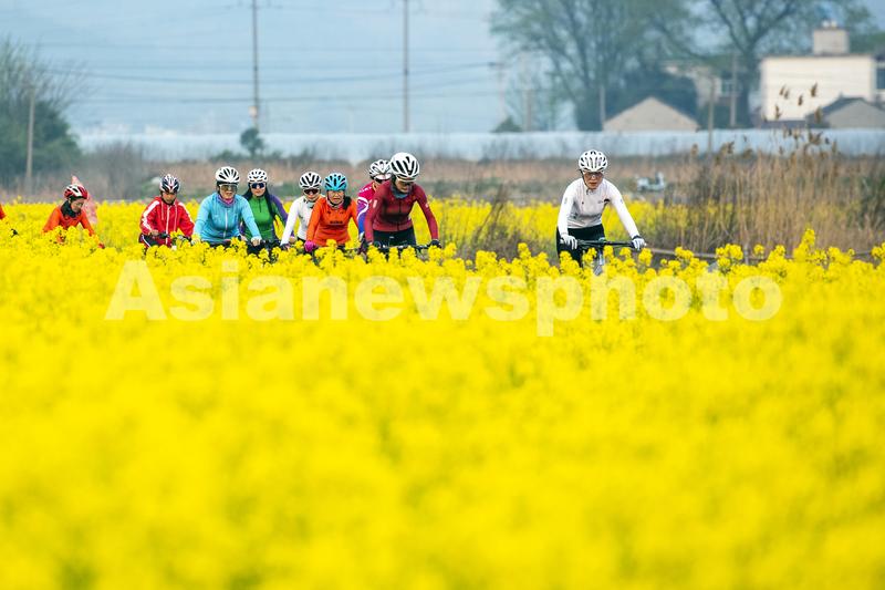 图片说明:2023年3月15日,自行车运动爱好者在安徽省芜湖市繁昌区峨山镇沈弄村的油菜花田里骑行锻炼。(无人机照片)