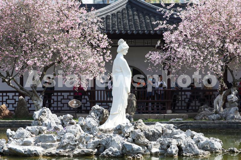 3月16日,游人在南京莫愁湖公园赏花拍照。