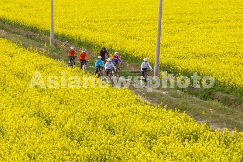 图片说明:2023年3月15日,自行车运动爱好者在安徽省芜湖市繁昌区峨山镇沈弄村的油菜花田里骑行锻炼。(无人机照片)